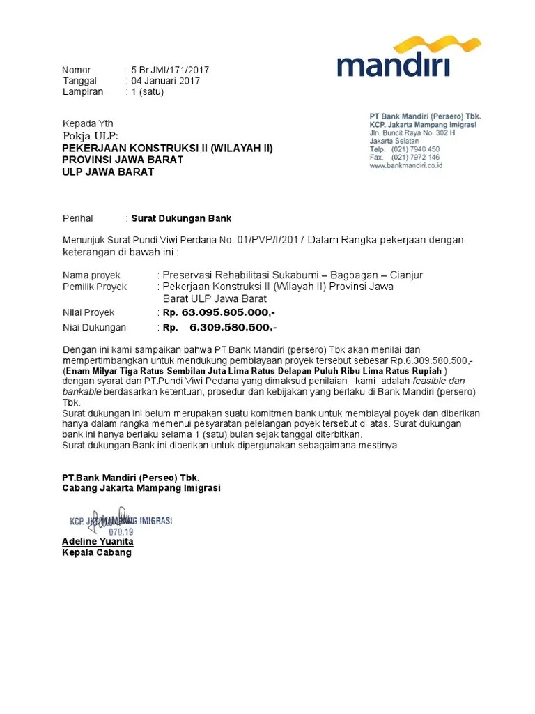 Contoh surat dukungan dan jaminan purnajual. Contoh surat dukungan bank untuk tender surat 29 . Ketika menjalankan sebuah proyek pembangunan, dapat dipastikan bahwa terkadang tidak . Jumlah dukungan dapat diberikan 10% dari nilai paket proyek/pekerjaan, . We offer image contoh format surat permohonan dukungan bank is .